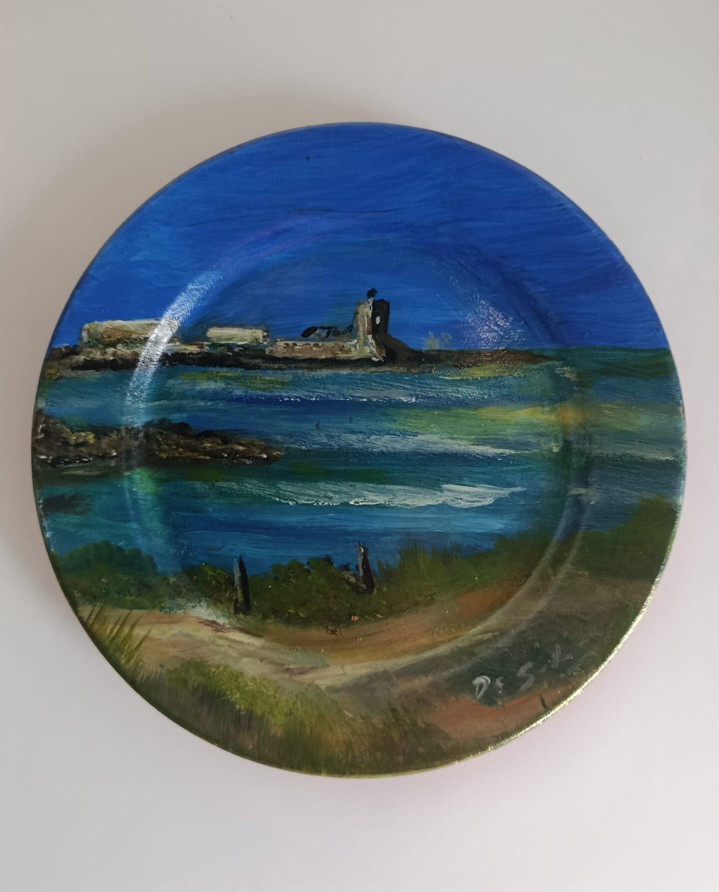 Plato decorativo de barro pintado a mano por De Salas, inspirado en el emblemático Castillo de Sancti Petri. Una pieza artesanal única que captura la luz, el color y la esencia del mar gaditano, ideal para aportar un toque mediterráneo y elegante a cualquier espacio.
